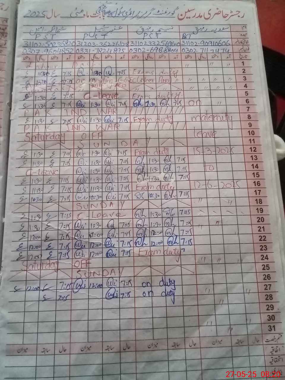 | 31**** | Na**** Ra**** | 1 | 0 | 1 | 0 | 0 | 0 | 0 | 0 | 0 | 0 | Exam Duty | |