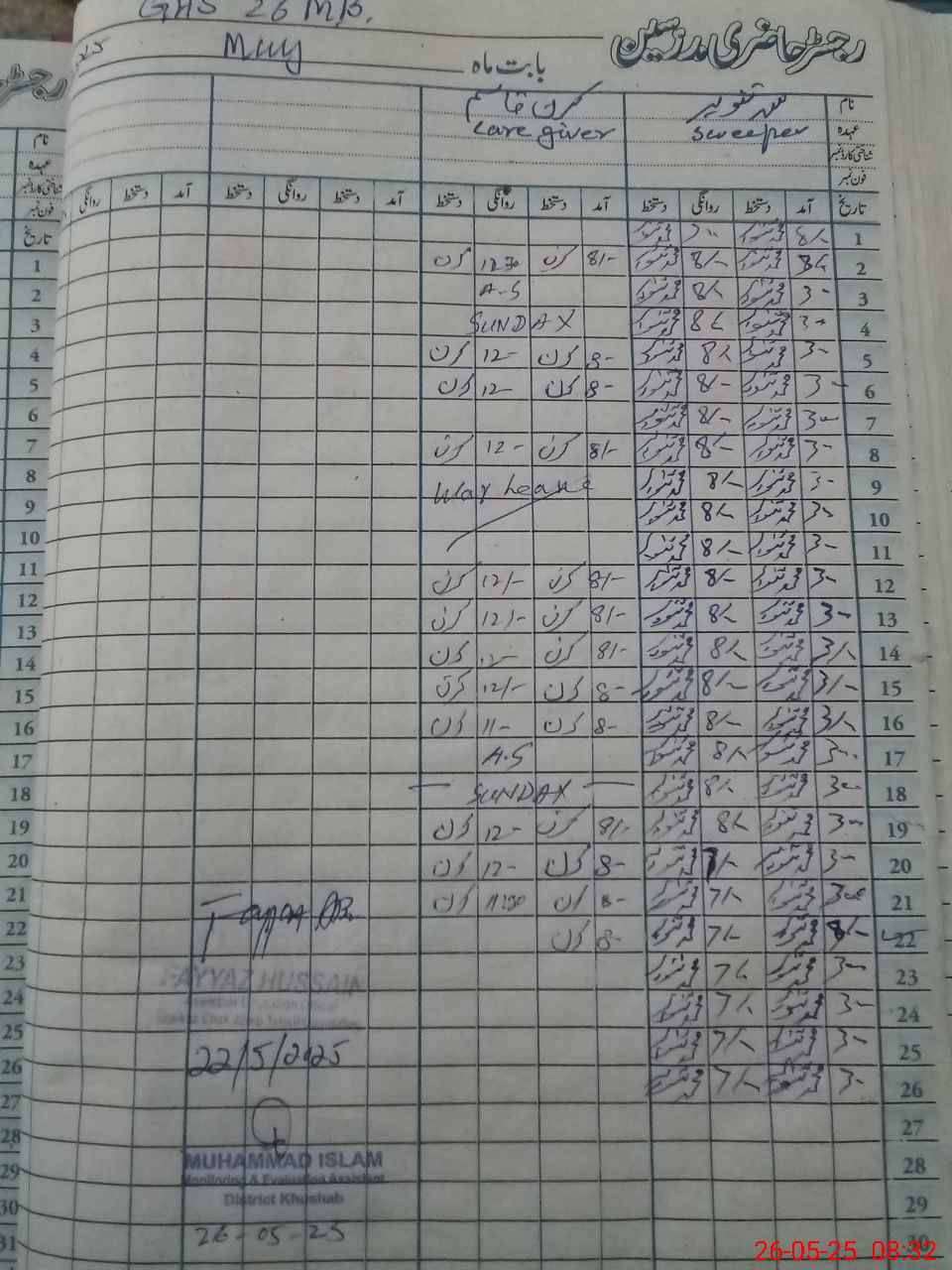 | CNIC | Full Name | Designation | R/C | Absence During Last Calender Month |