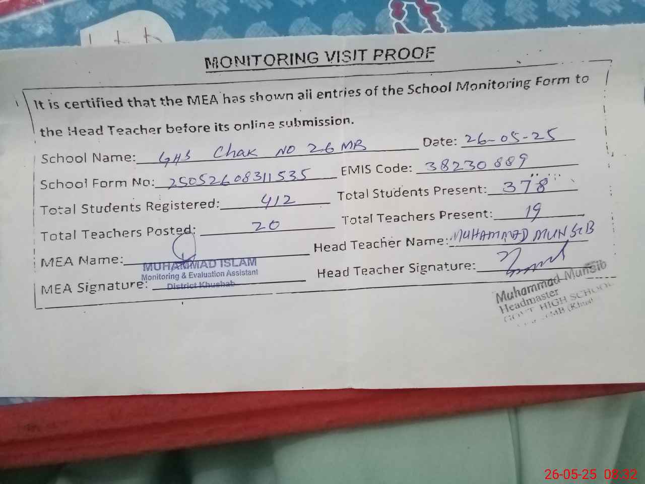 | EMIS Code: 38230889 | Name of School: GHS CHAK NO. 26/MB | |||