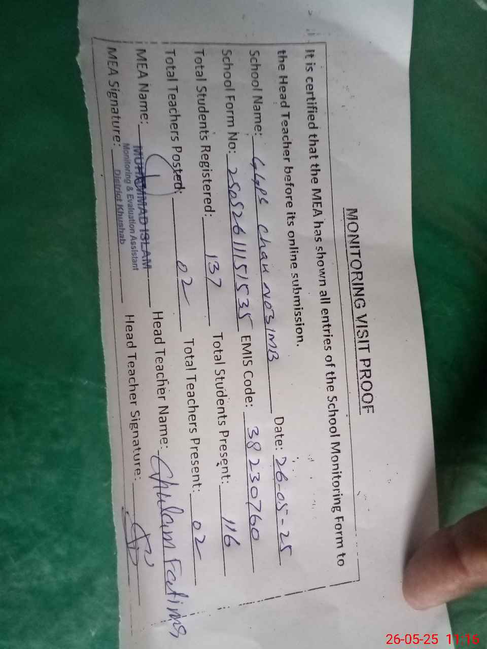 | Attendance Register | Head Teacher | MEA with School | Visit Proof |