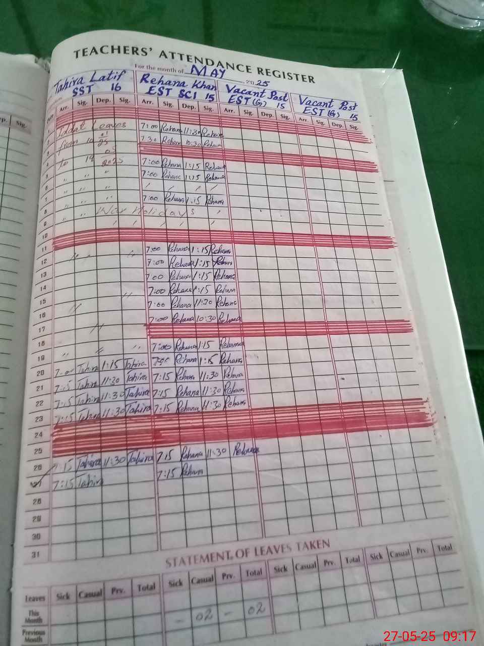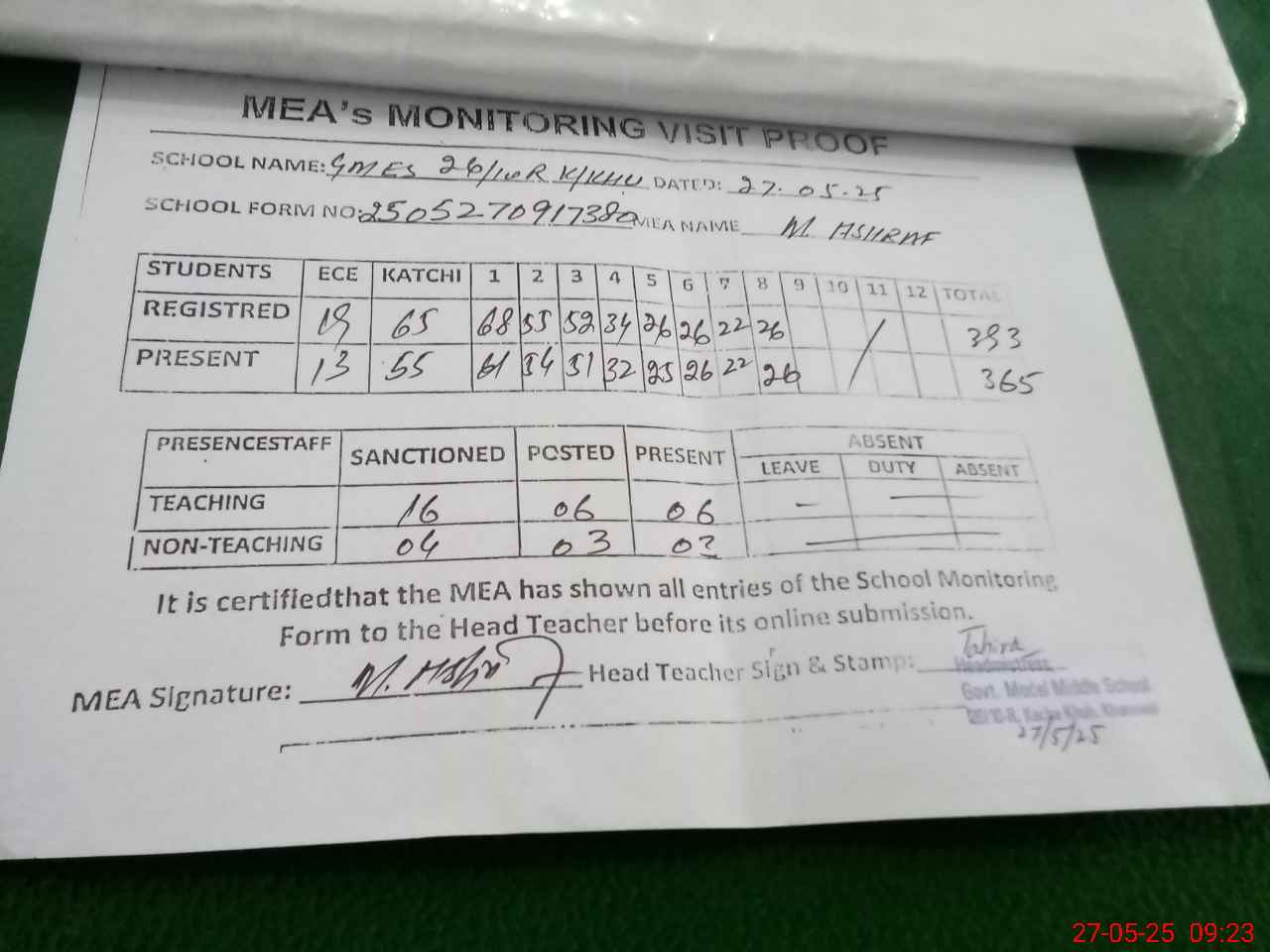 | Attendance Register | Head Teacher | MEA with School | Visit Proof |