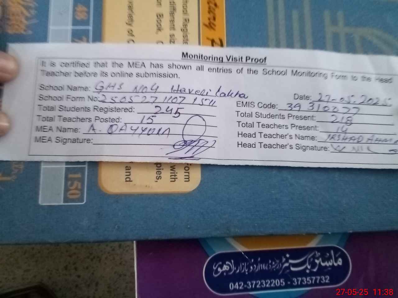 | Attendance Register | Head Teacher | MEA with School | Visit Proof |