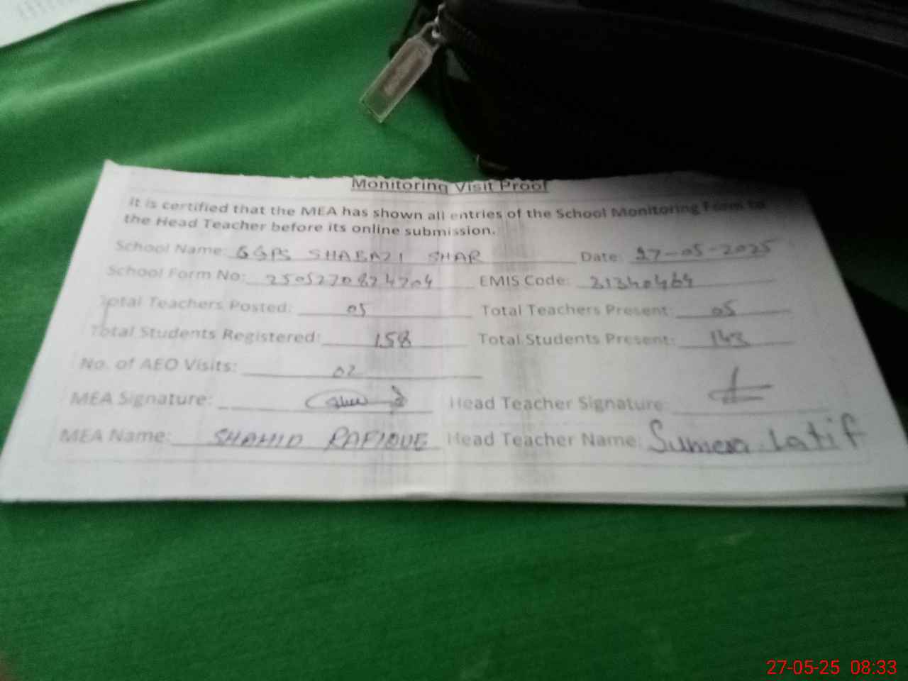 | Attendance Register | Head Teacher | MEA with School | Visit Proof |