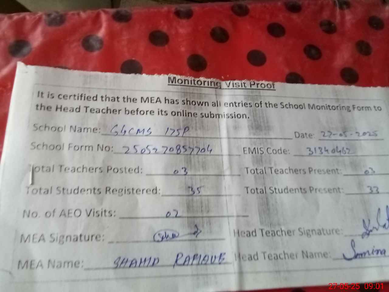 | Attendance Register | Head Teacher | MEA with School | Visit Proof |