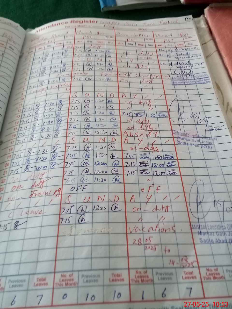 | 31**** | Sa**** Su**** | PST | Regular | 0 | 0 | 0 | 0 | 0 | 0 | 0 | 0 | 0 | Exam Duty |