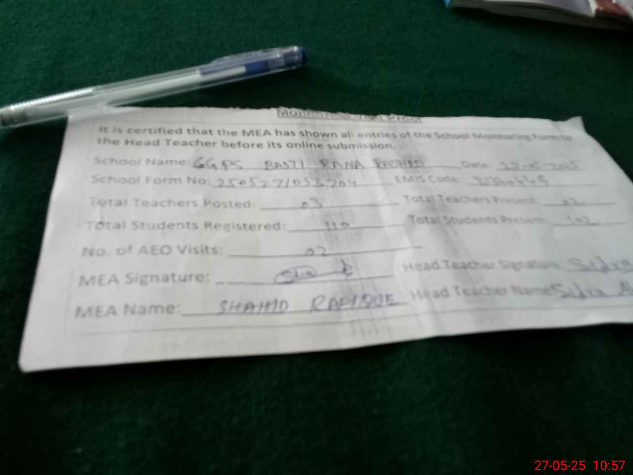 | Attendance Register | Head Teacher | MEA with School | Visit Proof |