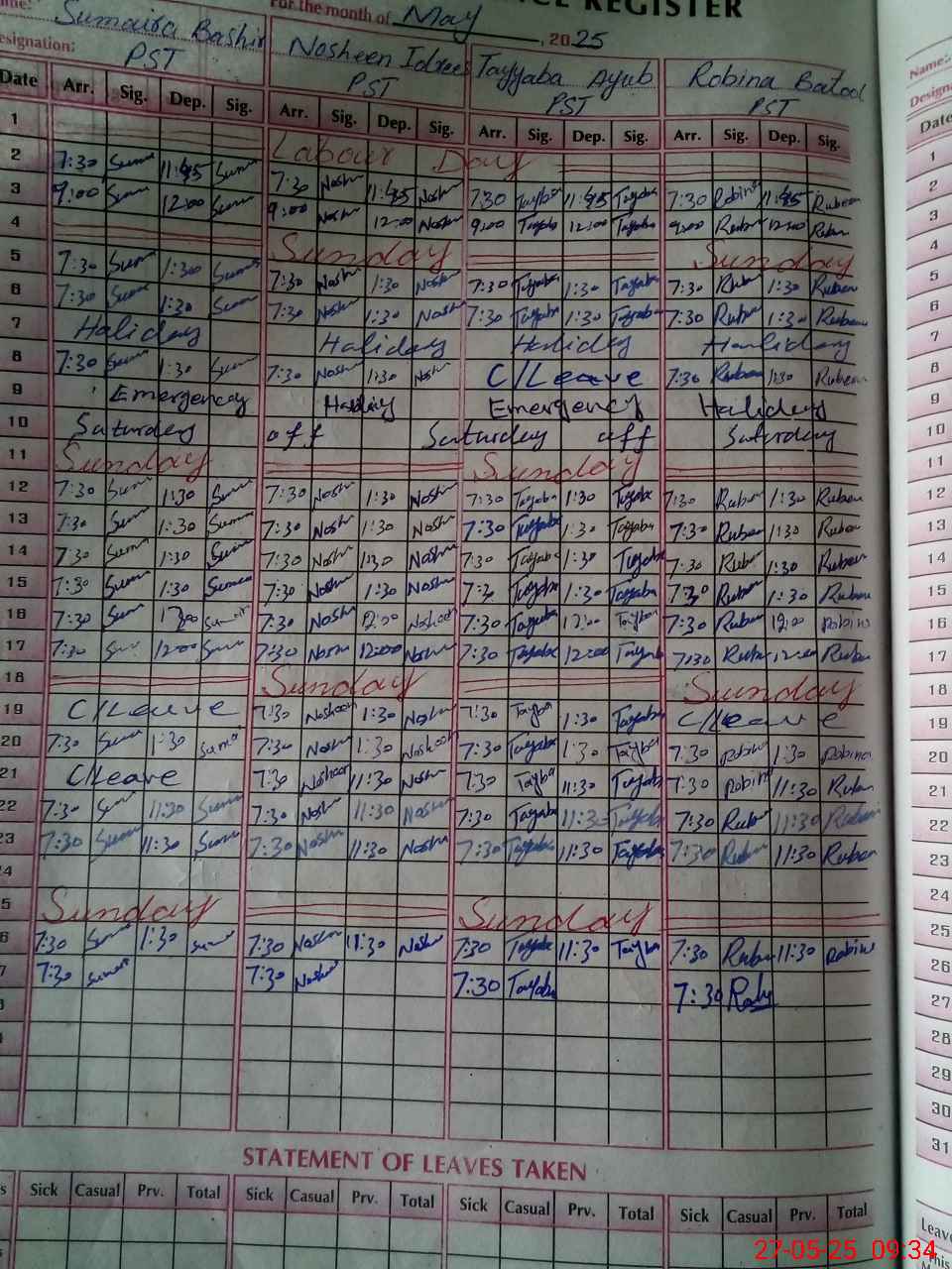 | CNIC | Full Name | Designation | R/C | Absence During Last Calender Month |