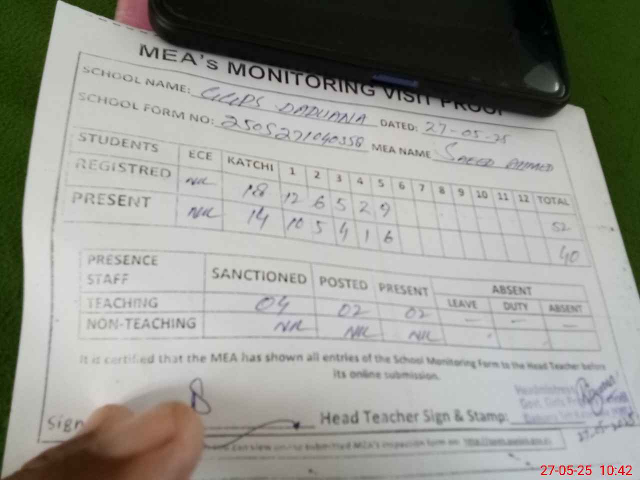 | Attendance Register | Head Teacher | MEA with School | Visit Proof |