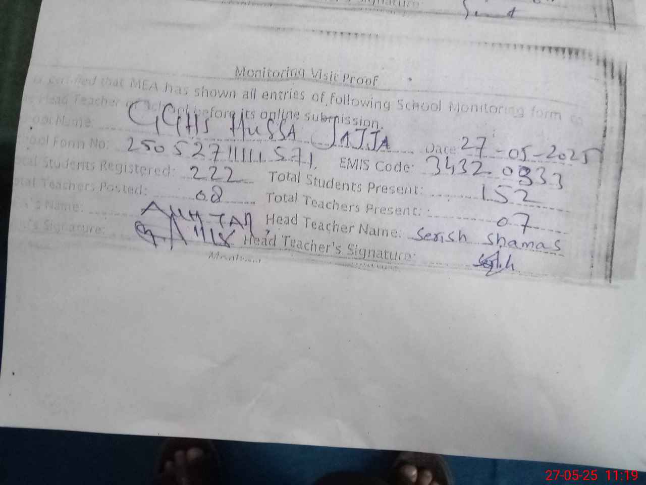 | Attendance Register | Head Teacher | MEA with School | Visit Proof |