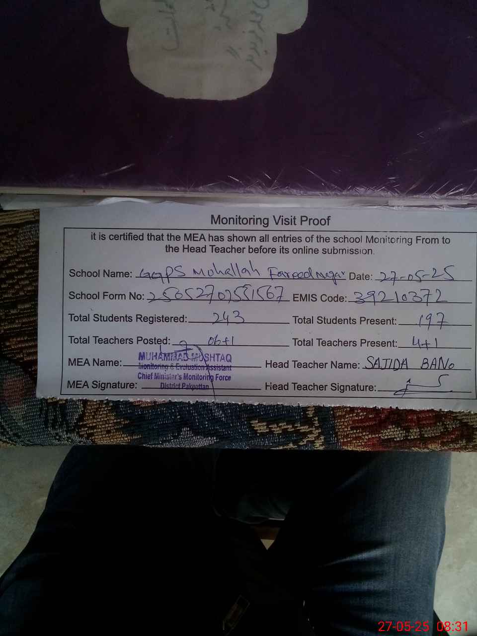 | Attendance Register | Head Teacher | MEA with School | Visit Proof |