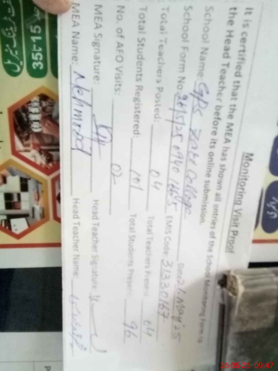 | Attendance Register | Head Teacher | MEA with School | Visit Proof |
