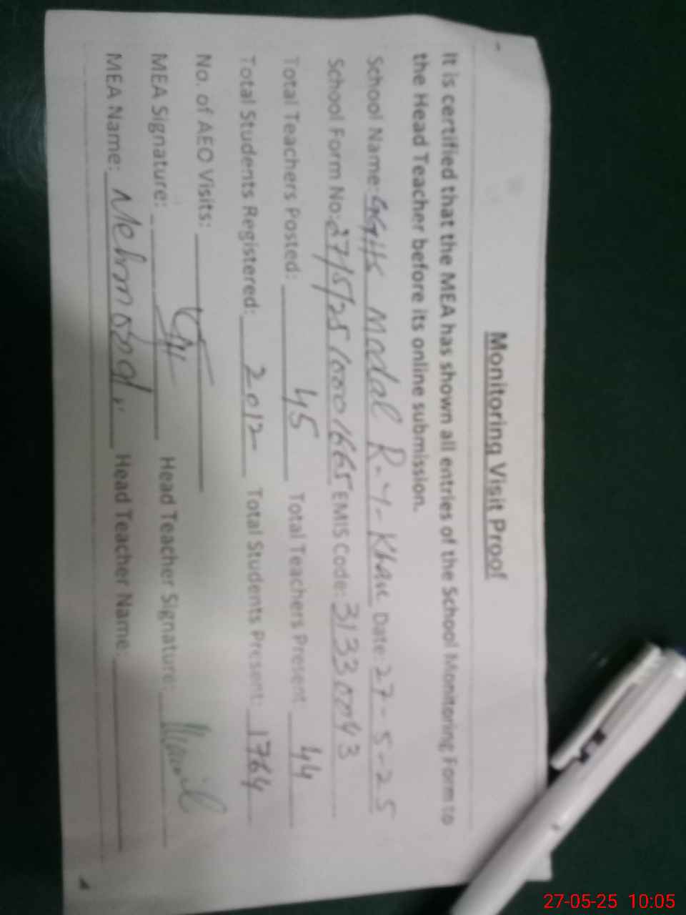 | Attendance Register | Head Teacher | MEA with School | Visit Proof |