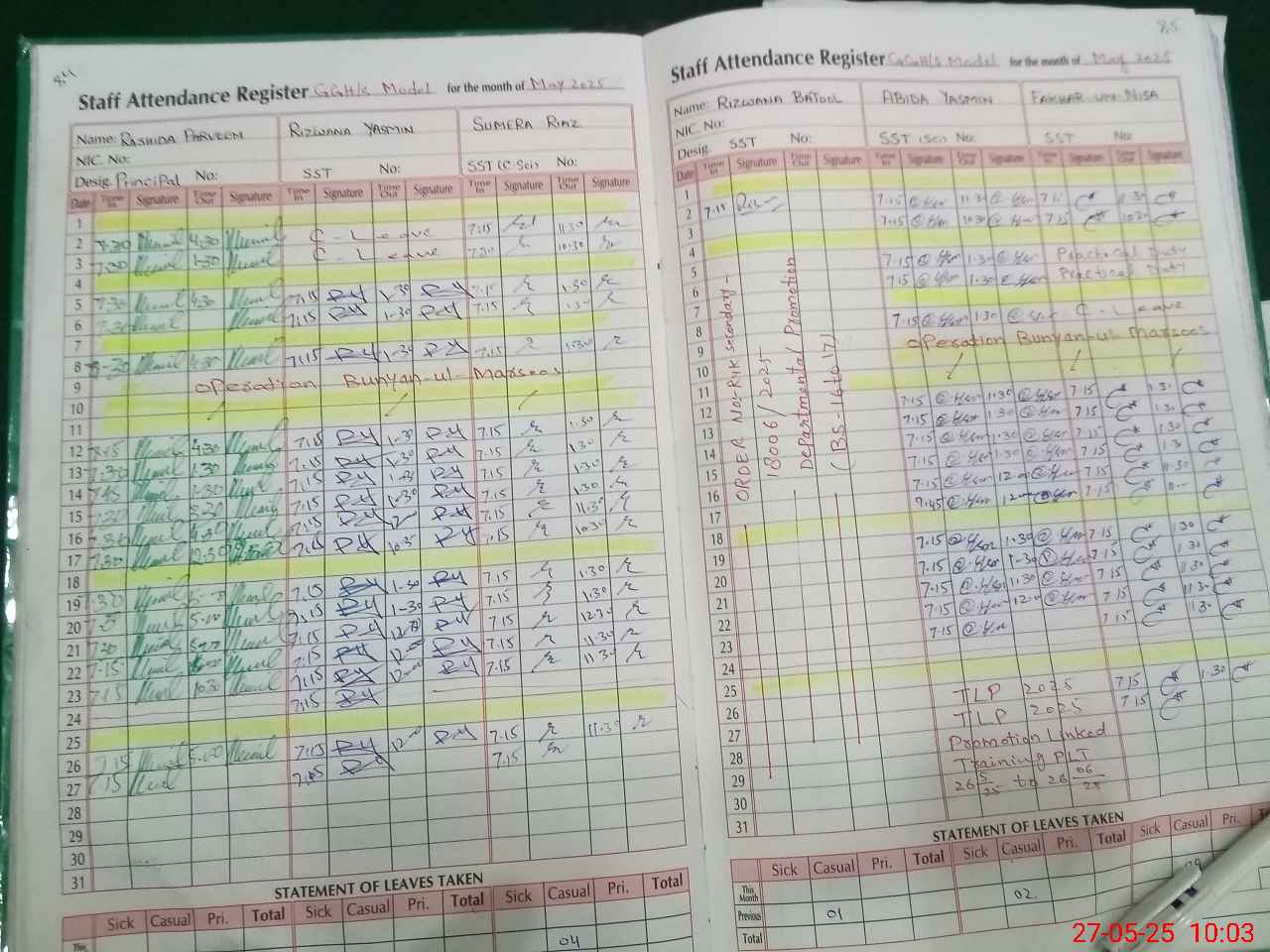 | CNIC | Full Name | Designation | R/C | Absence During Last Calender Month |
