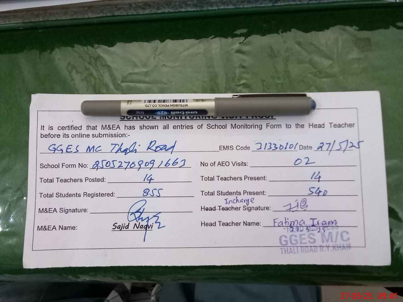| Attendance Register | Head Teacher | MEA with School | Visit Proof |