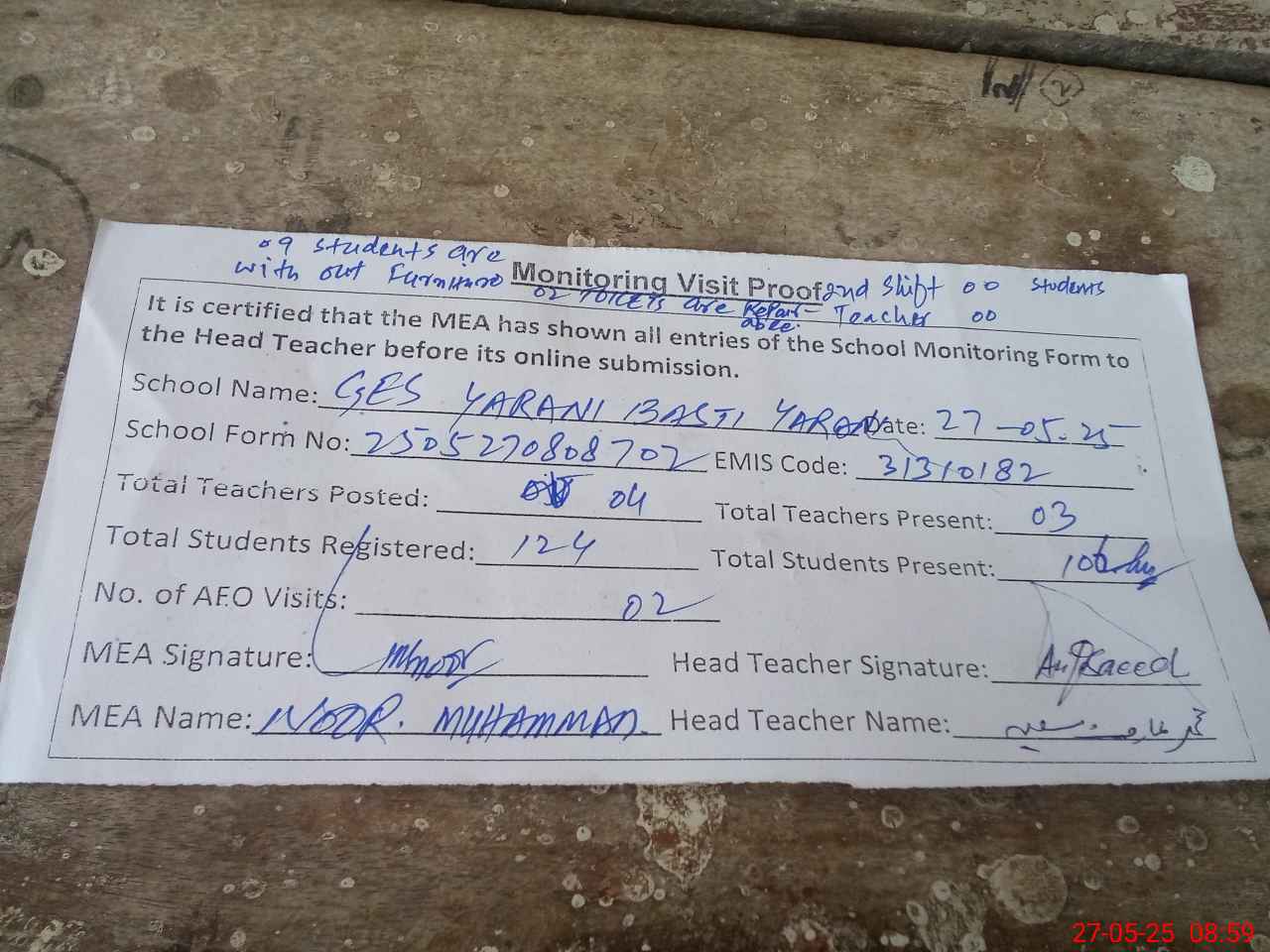 | Attendance Register | Head Teacher | MEA with School | Visit Proof |