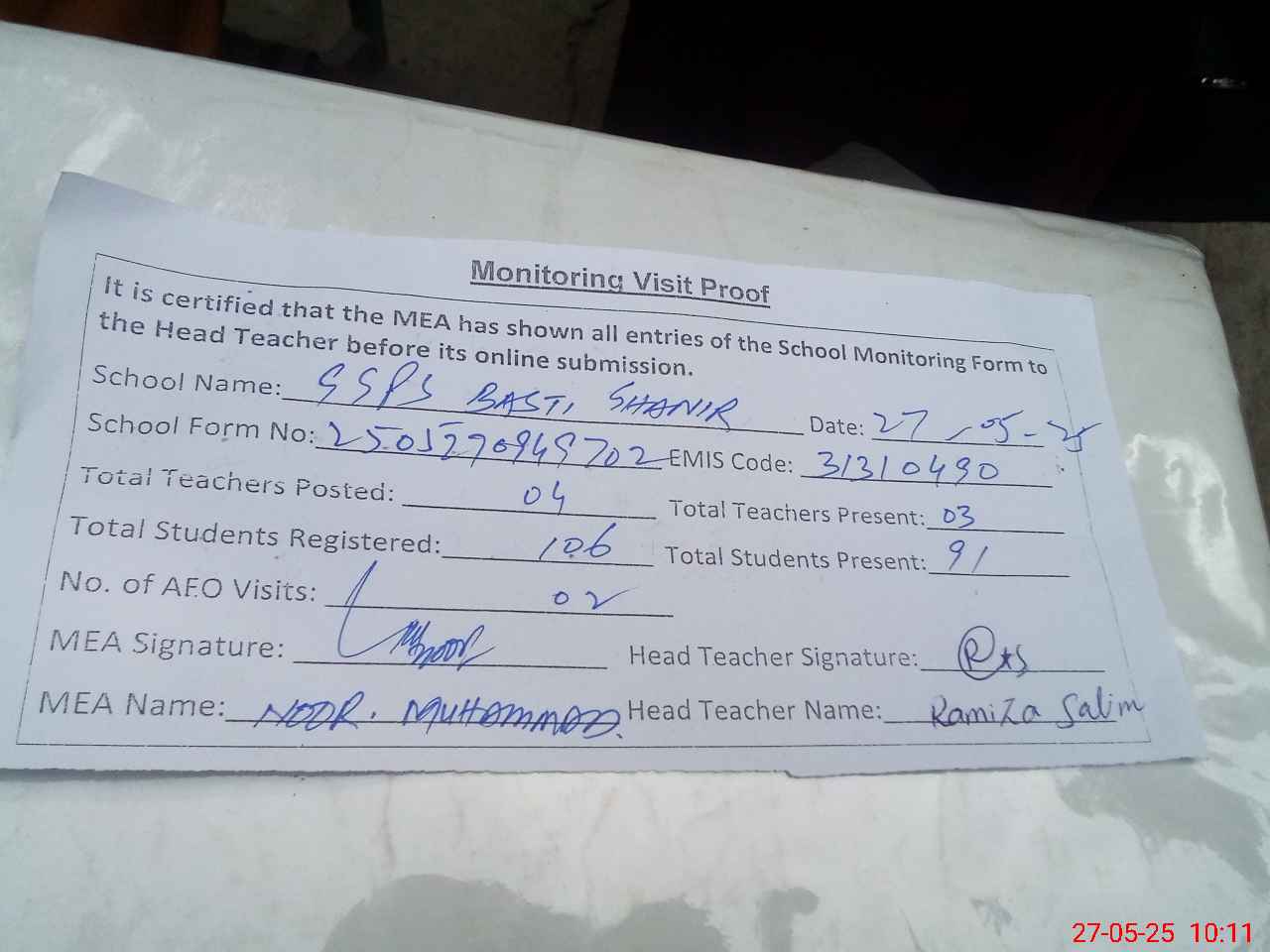 | Attendance Register | Head Teacher | MEA with School | Visit Proof |