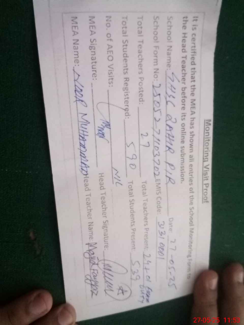 | Attendance Register | Head Teacher | MEA with School | Visit Proof |