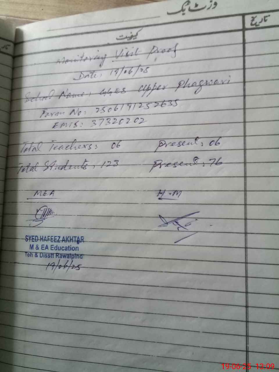 | Remarks (Use Separate Page if Required): NSB record not updated in PMIU and SIS both Apps Students of class 1 listed in pmiu app are not updated Some students are in classes 4 and 5 while a few students have left school There are big cracks in boundary wall needs urgent attention | |||||