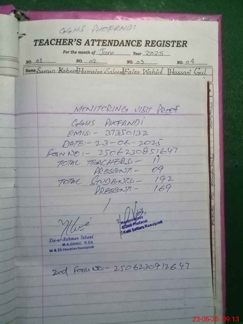 | Attendance Register | Head Teacher | MEA with School | Visit Proof |