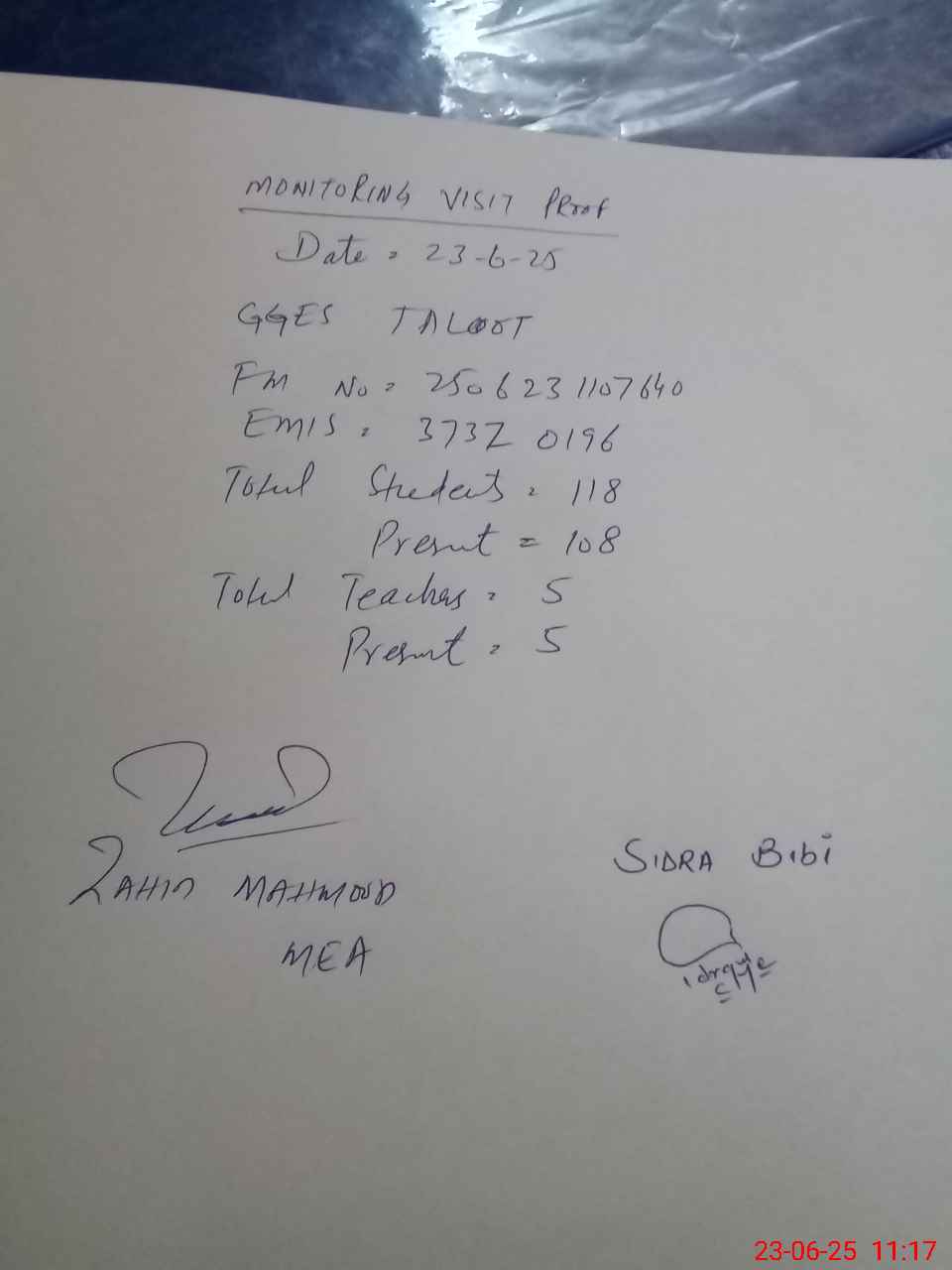 | Attendance Register | Head Teacher | MEA with School | Visit Proof |