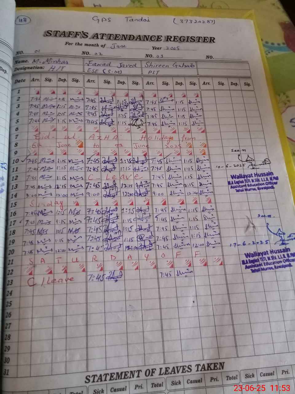 | CNIC | Full Name | Designation | R/C | Absence During Last Calender Month |