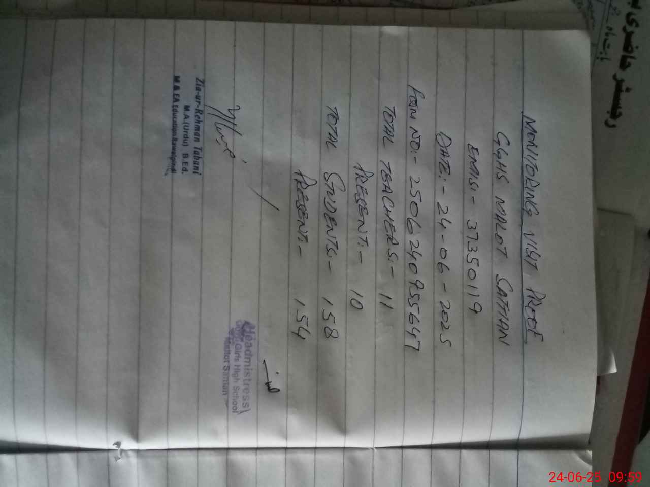 | Attendance Register | Head Teacher | MEA with School | Visit Proof |