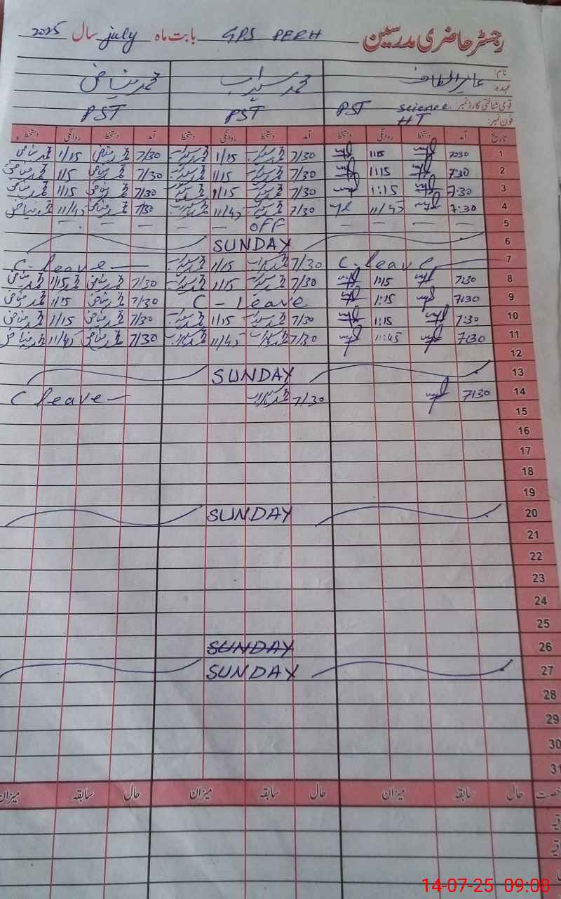 | CNIC | Full Name | Designation | R/C | Absence During Last Calender Month |
