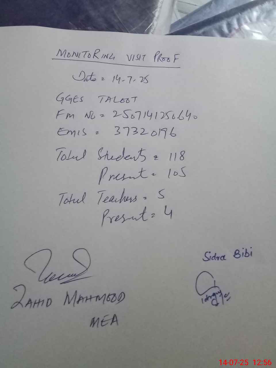 | Attendance Register | Head Teacher | MEA with School | Visit Proof |