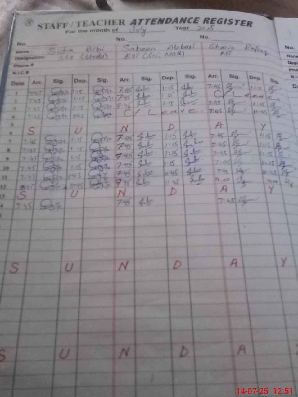 | CNIC | Full Name | Designation | R/C | Absence During Last Calender Month |