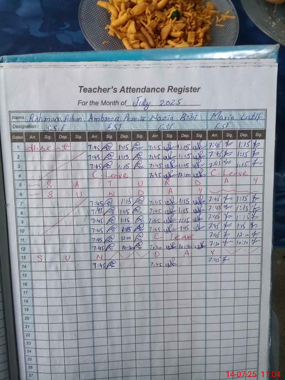 | CNIC | Full Name | Designation | R/C | Absence During Last Calender Month |