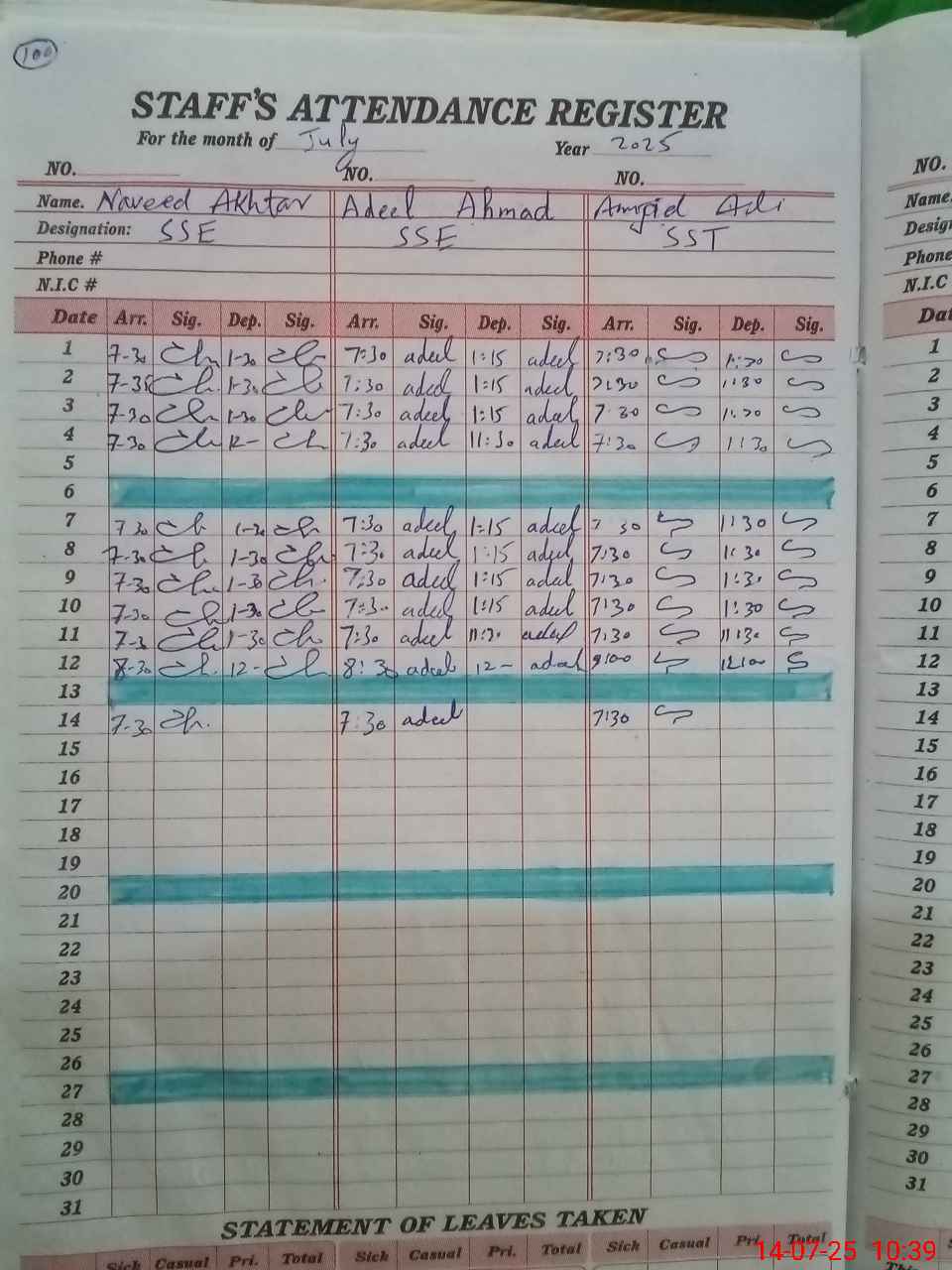 | CNIC | Full Name | Designation | R/C | Absence during last cal. month |