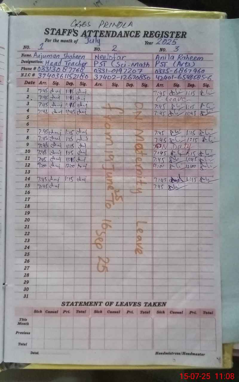 | Name: AN**** SH**** Designation: (School Headmaster's/Headmistress's) PST ARTS Phone/Cell Number: 03**** |