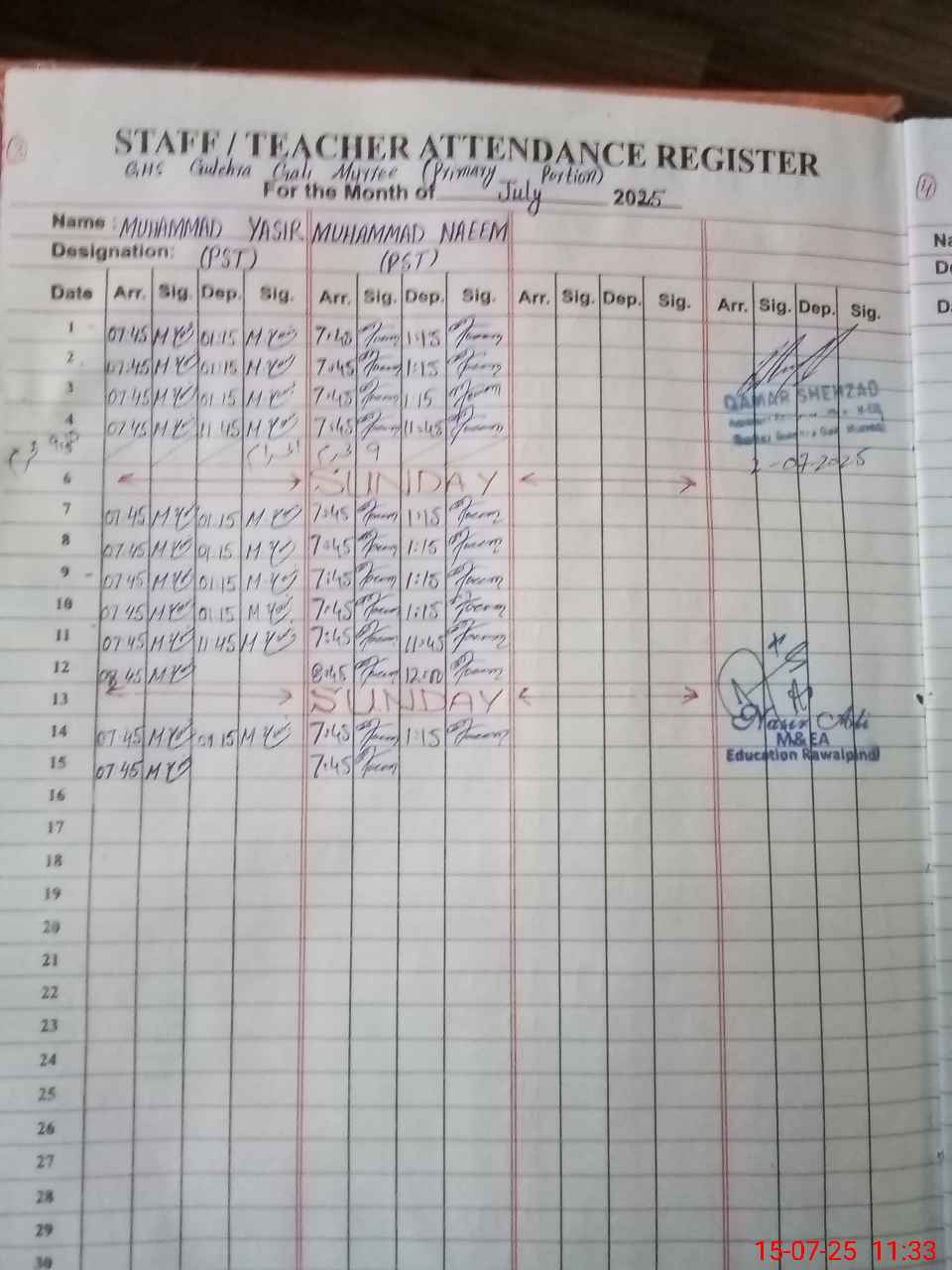 | CNIC | Full Name | Designation | R/C | Absence During Last Calender Month |