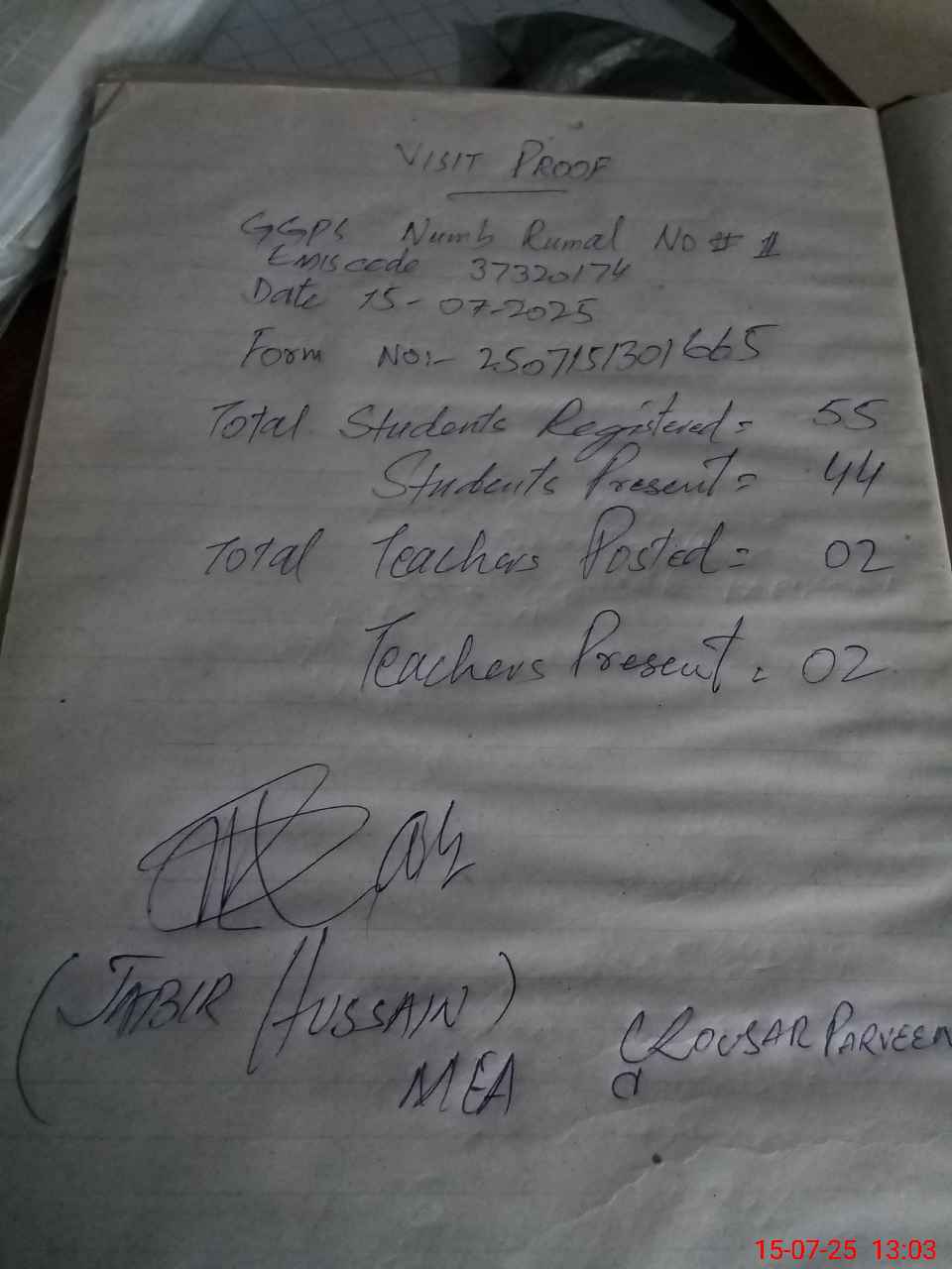| Attendance Register | Head Teacher | MEA with School | Visit Proof |