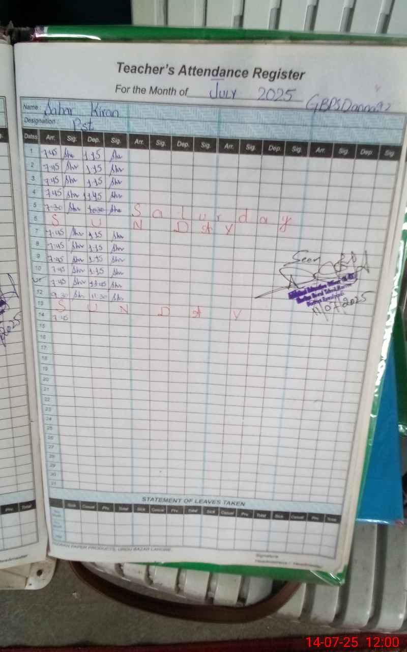 | CNIC | Full Name | Designation | R/C | Absence During Last Calender Month |
