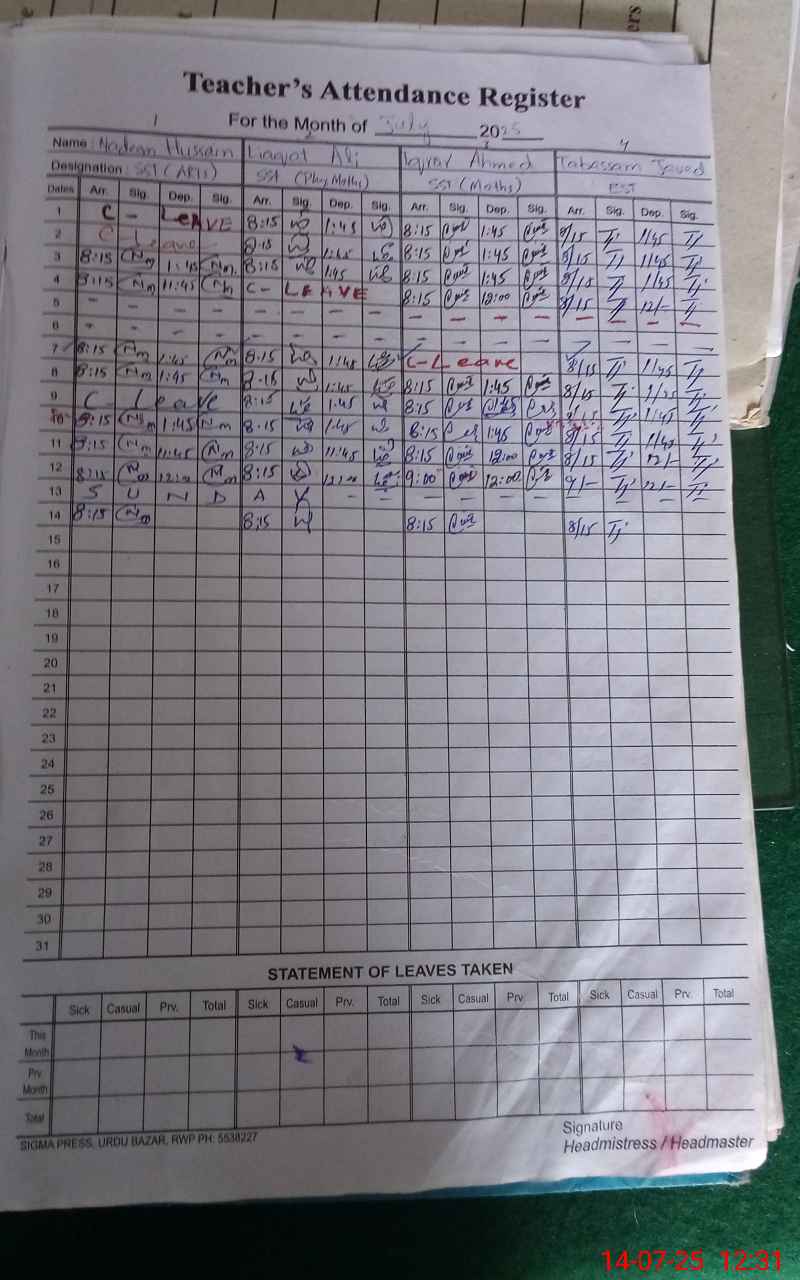 | CNIC | Full Name | Designation | R/C | Absence During Last Calender Month |