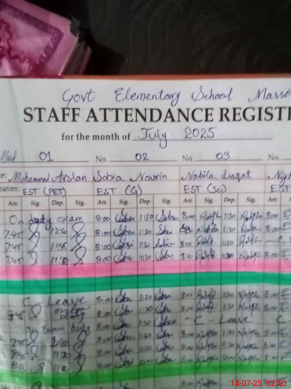 | CNIC | Full Name | Designation | R/C | Absence During Last Calender Month |