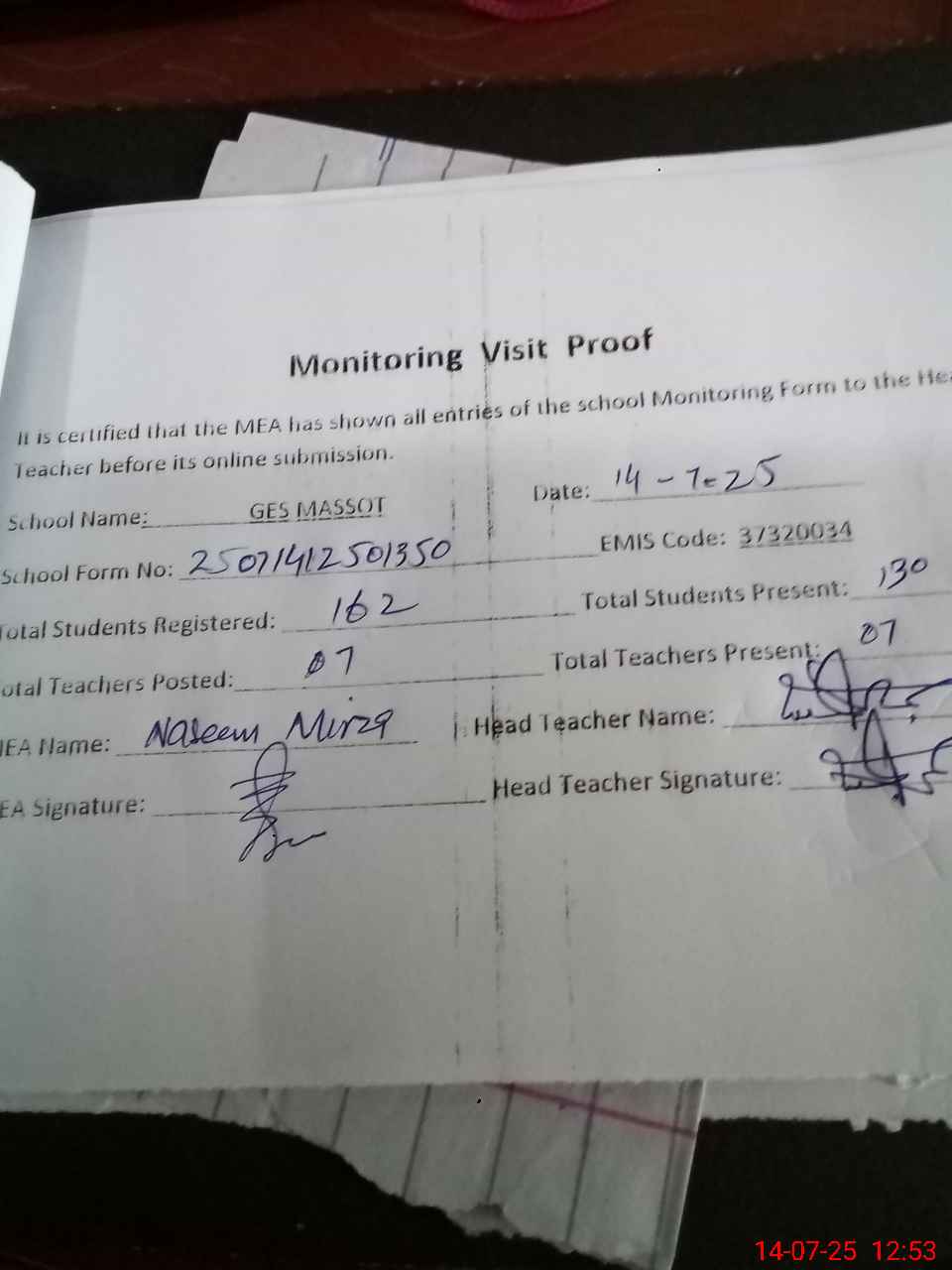 | Attendance Register | Head Teacher | MEA with School | Visit Proof |