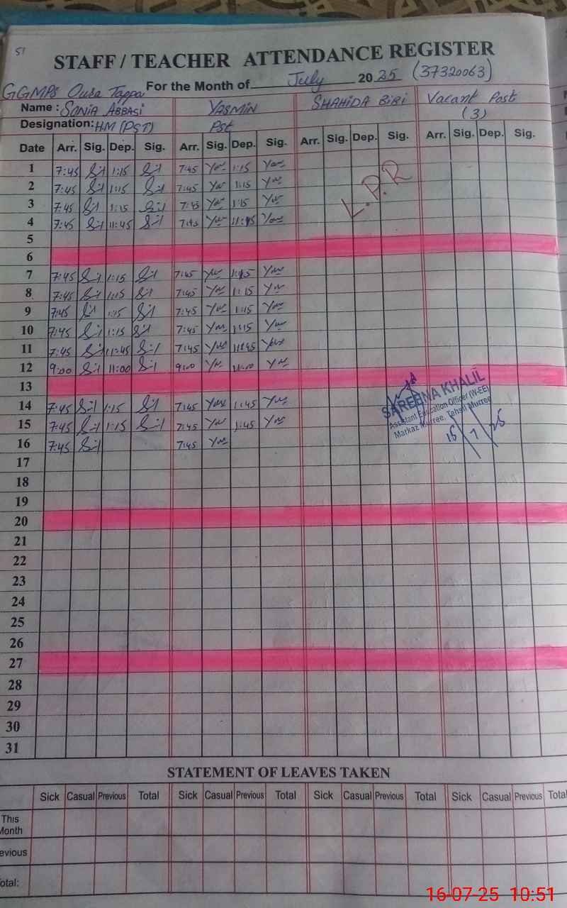 | District: MURREE | Tehsil: MURREE | Markaz: MURREE - FEMALE | Level: Primary | |