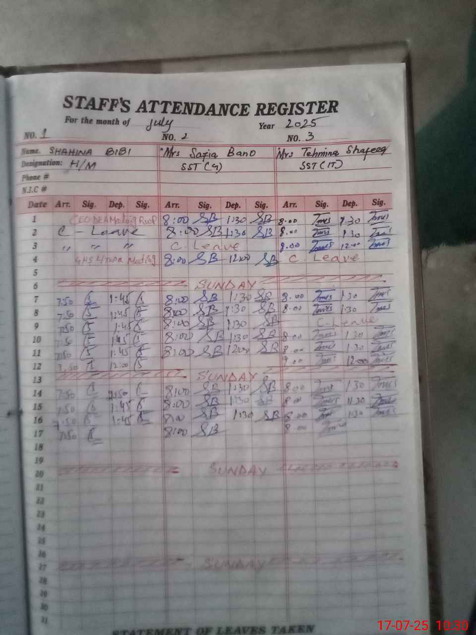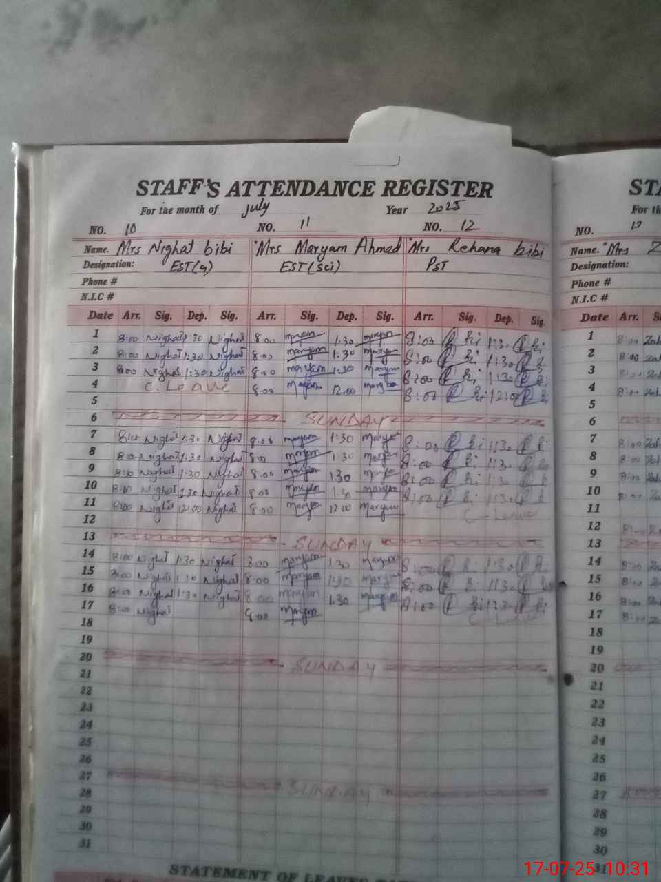 | CNIC | Full Name | Designation | R/C | Absence During Last Calender Month |