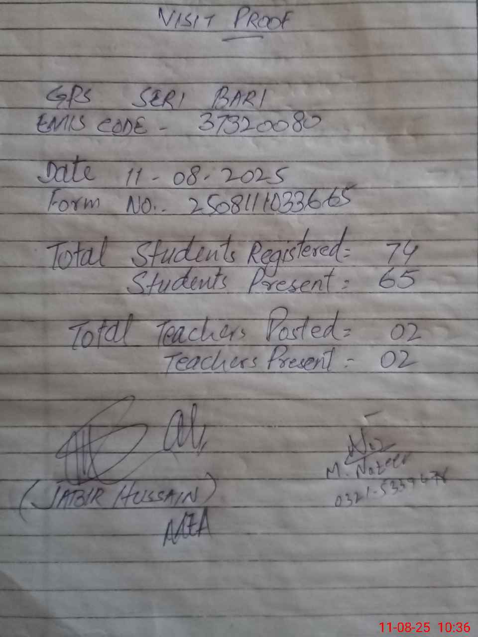 | Attendance Register | Head Teacher | MEA with School | Visit Proof |