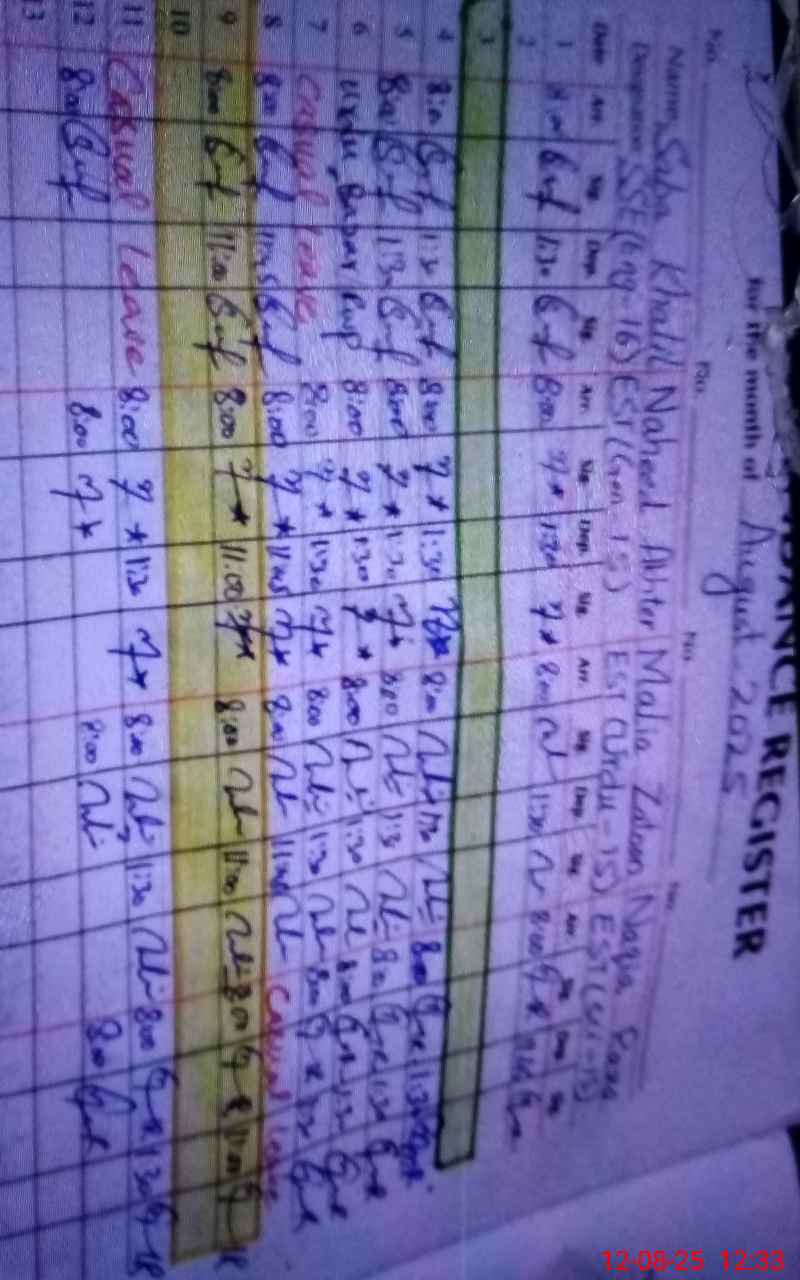 | CNIC | Full Name | Designation | R/C | Absence During Last Calender Month |