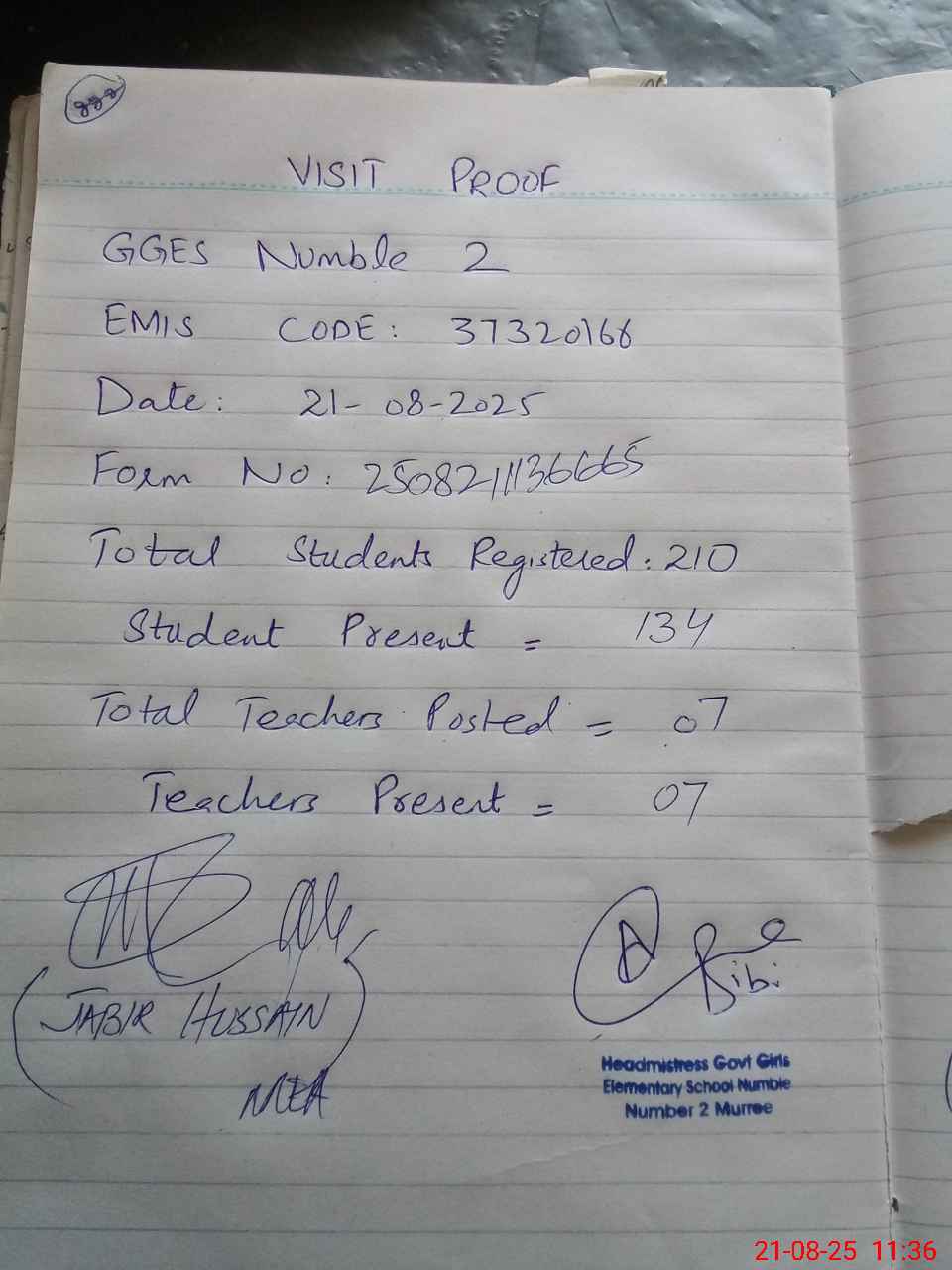 | Total no. of Classrooms: 6 No. of Classrooms Used for Teaching: 6 No. of Classrooms Storing Old Furniture, FTBs, etc: 0Comments if Any: Random class check list not updated in pmiu application One non teaching staff attached to gmps Numbal behramall wef March 2025 to till date Boundary wall partially |