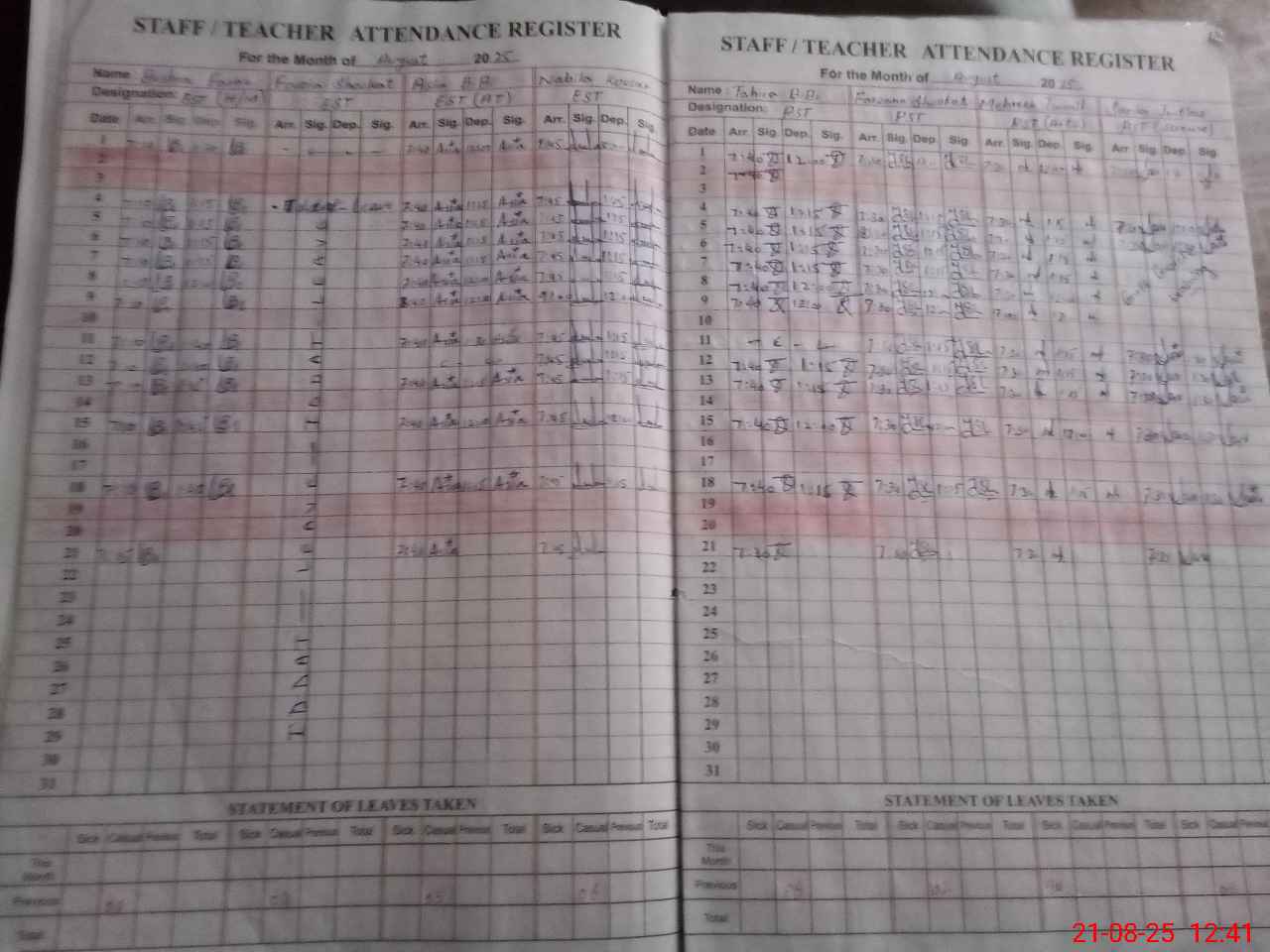 | Total no. of Classrooms: 11 No. of Classrooms Used for Teaching: 10 No. of Classrooms Storing Old Furniture, FTBs, etc: 0Comments if Any: One teacher name Fouzia Shoukat EST on idat leave wef 29th July 2025 Random class check list not updated in pmiu app |