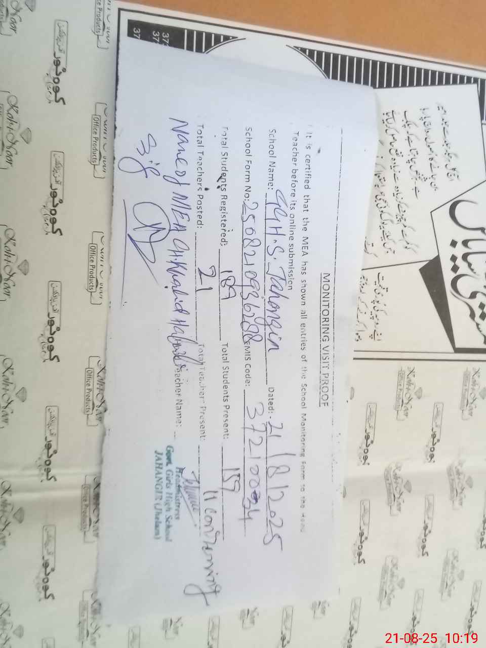 | Certified that this School was Inspected by the Undersigned MEA/DMO Today and the Information Stated Above is as Per Record. | |||||