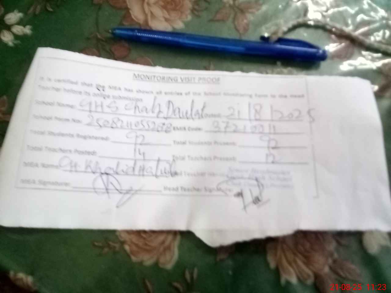 | Attendance Register | Head Teacher | MEA with School | Visit Proof |