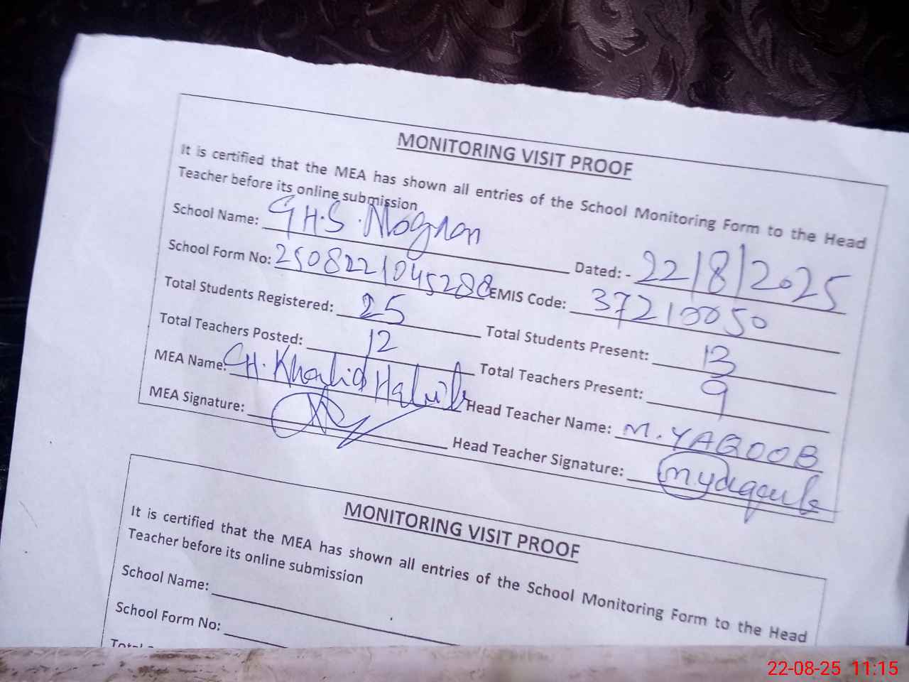 | Monitoring Date: 22-08-2025 | Start Time: 22-08-2025 10:45 AM | End Time: 22-08-2025 11:16 AM | Name of MEA: Kh**** ha**** | |
