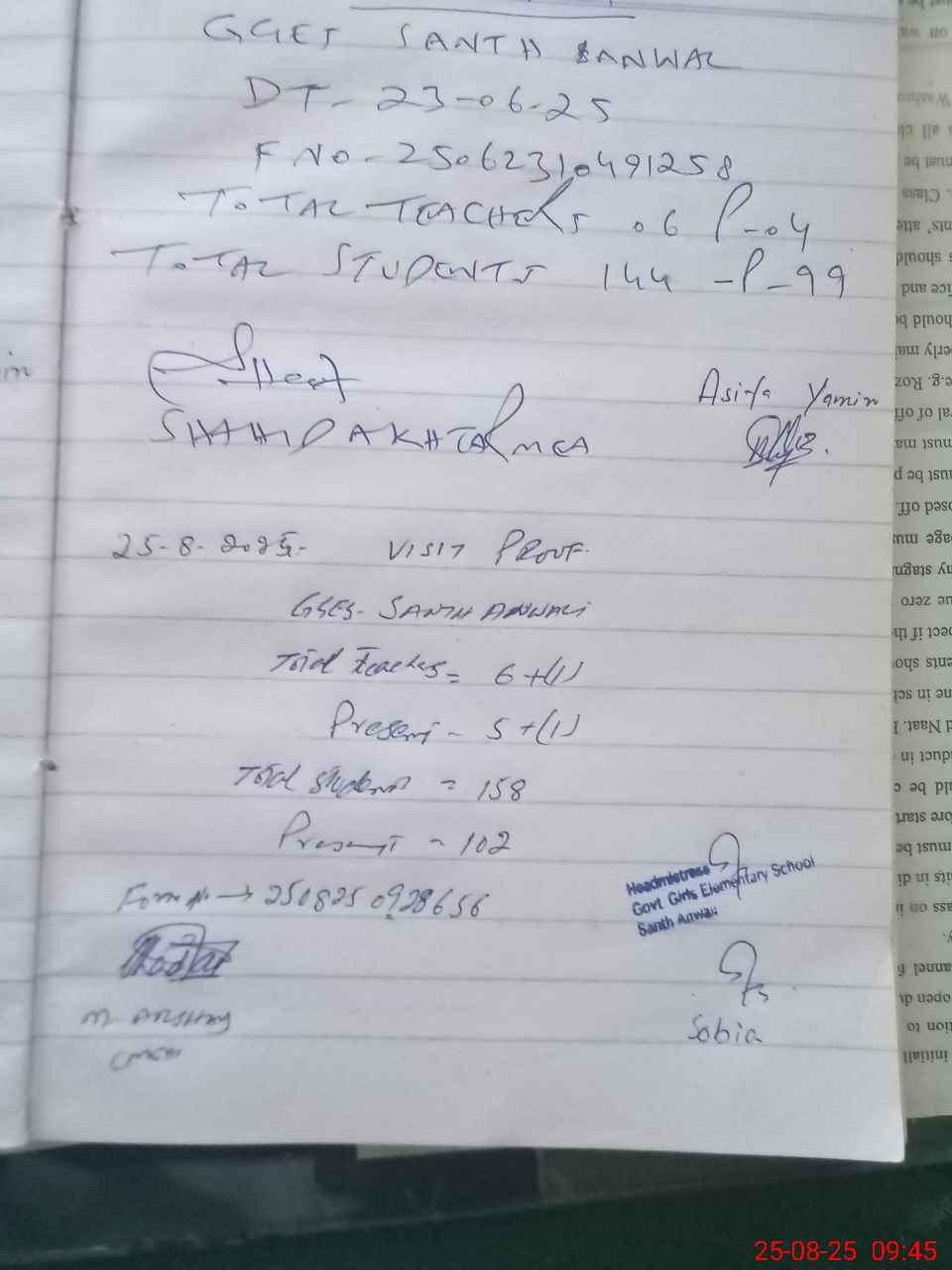 | Attendance Register | Head Teacher | MEA with School | Visit Proof |