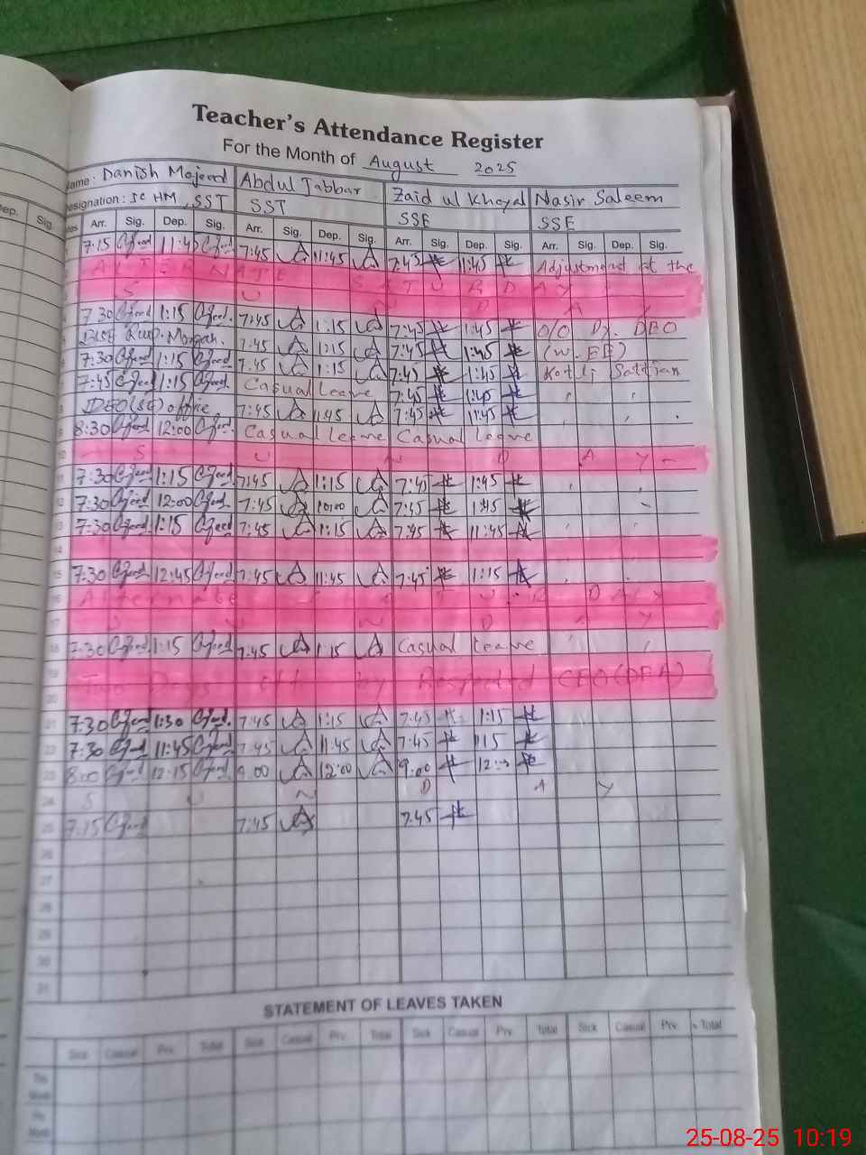 | CNIC | Full Name | Designation | R/C | Absence during last cal. month |