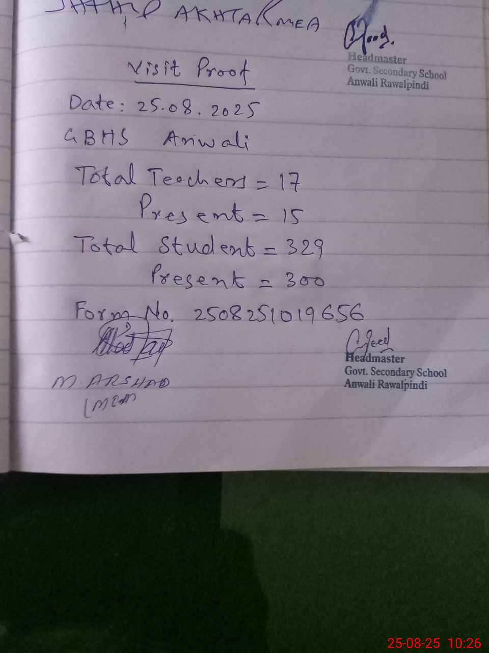 | Attendance Register | Head Teacher | MEA with School | Visit Proof |